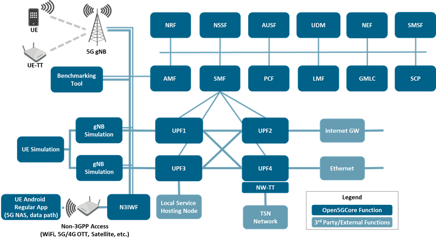 - Fundamental 5G core network functionality (AMF, SMF, AUSF, UDM, NRF, UPF)